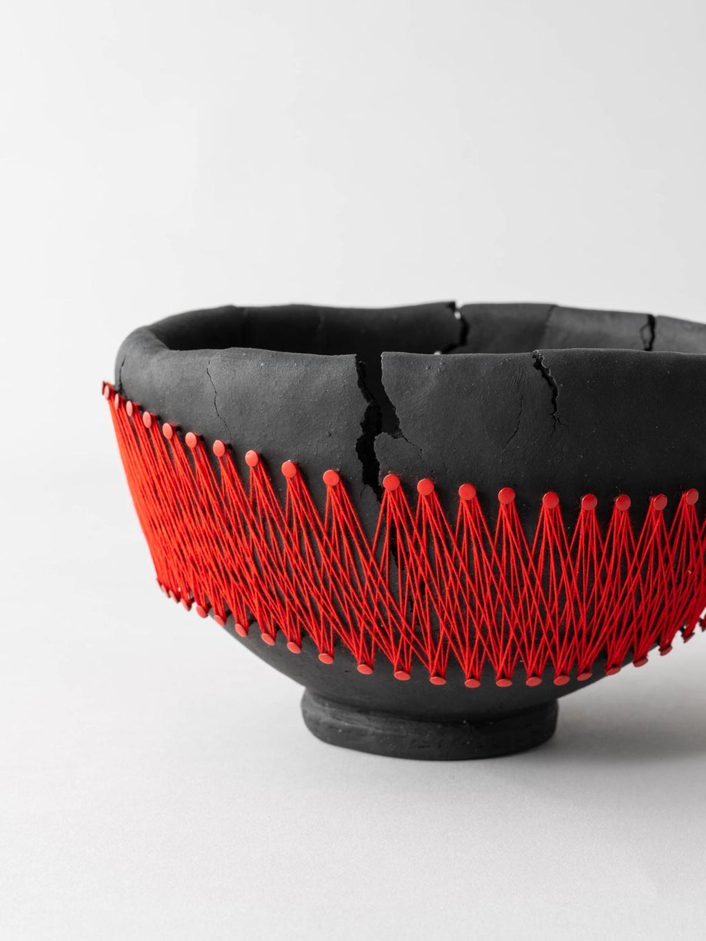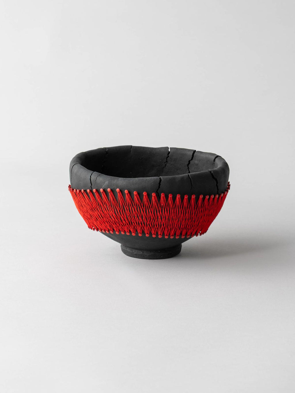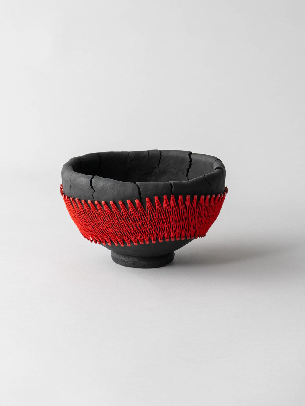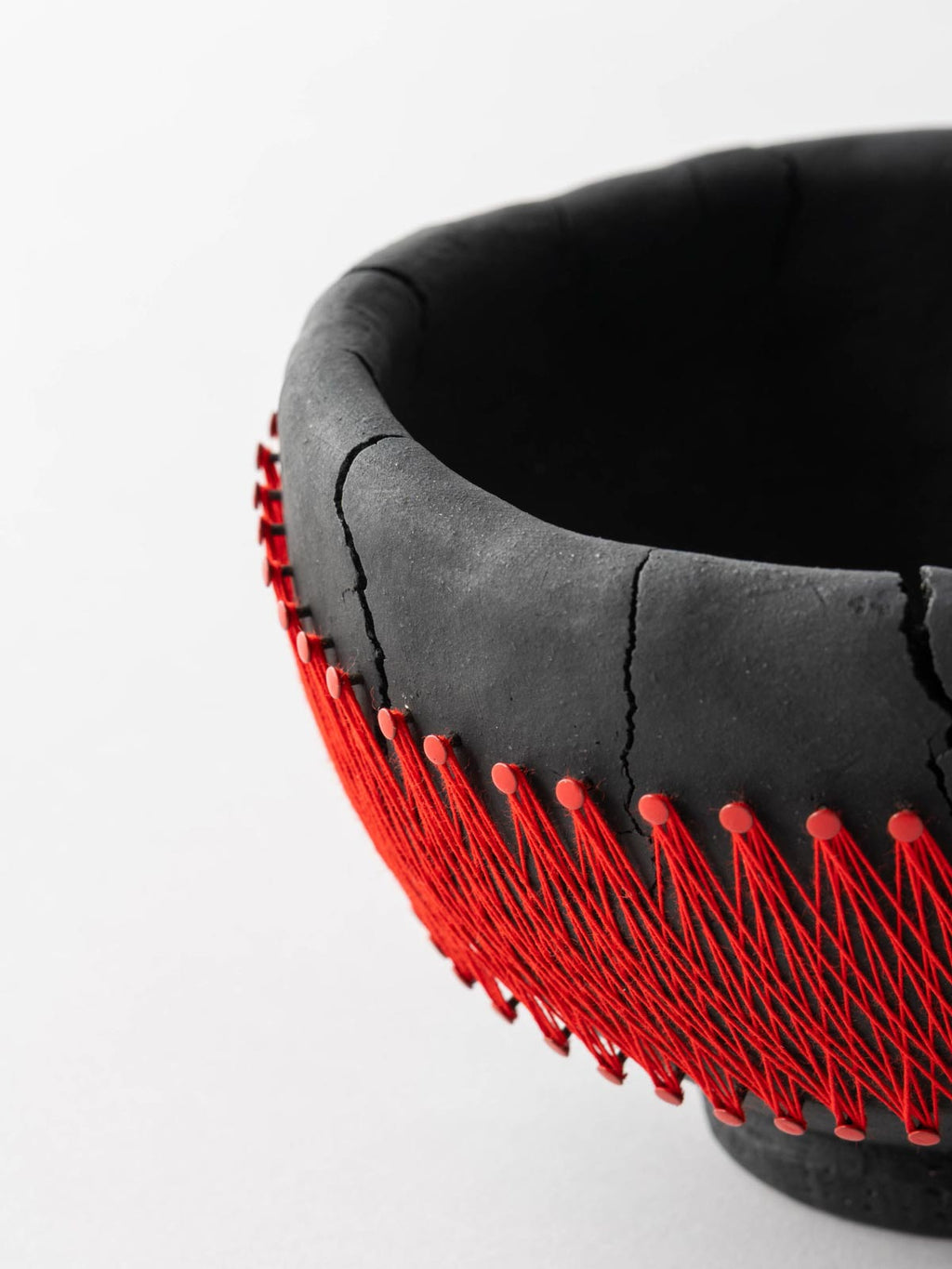 代表作の「dress」シリーズでは、「装う」をテーマに陶磁器の修繕技法の金継ぎに着目し、黒い楽焼の器をあえて破損し、割れによって生じた傷に、釘と糸で“ドレス”を纏わせる。「MYO」シリーズは、黒土の器に幾何学模様を刻み込み、モノトーンゆえの“白と黒どちらを見るか”という視覚の揺らぎを狙う。