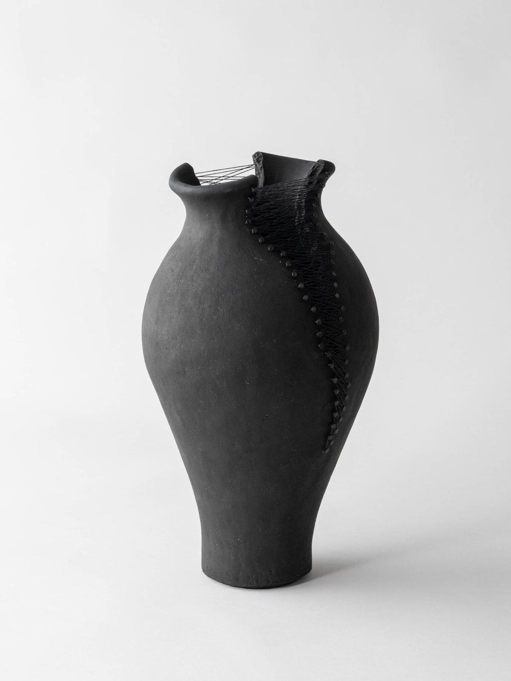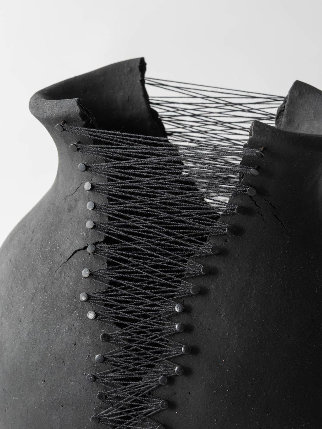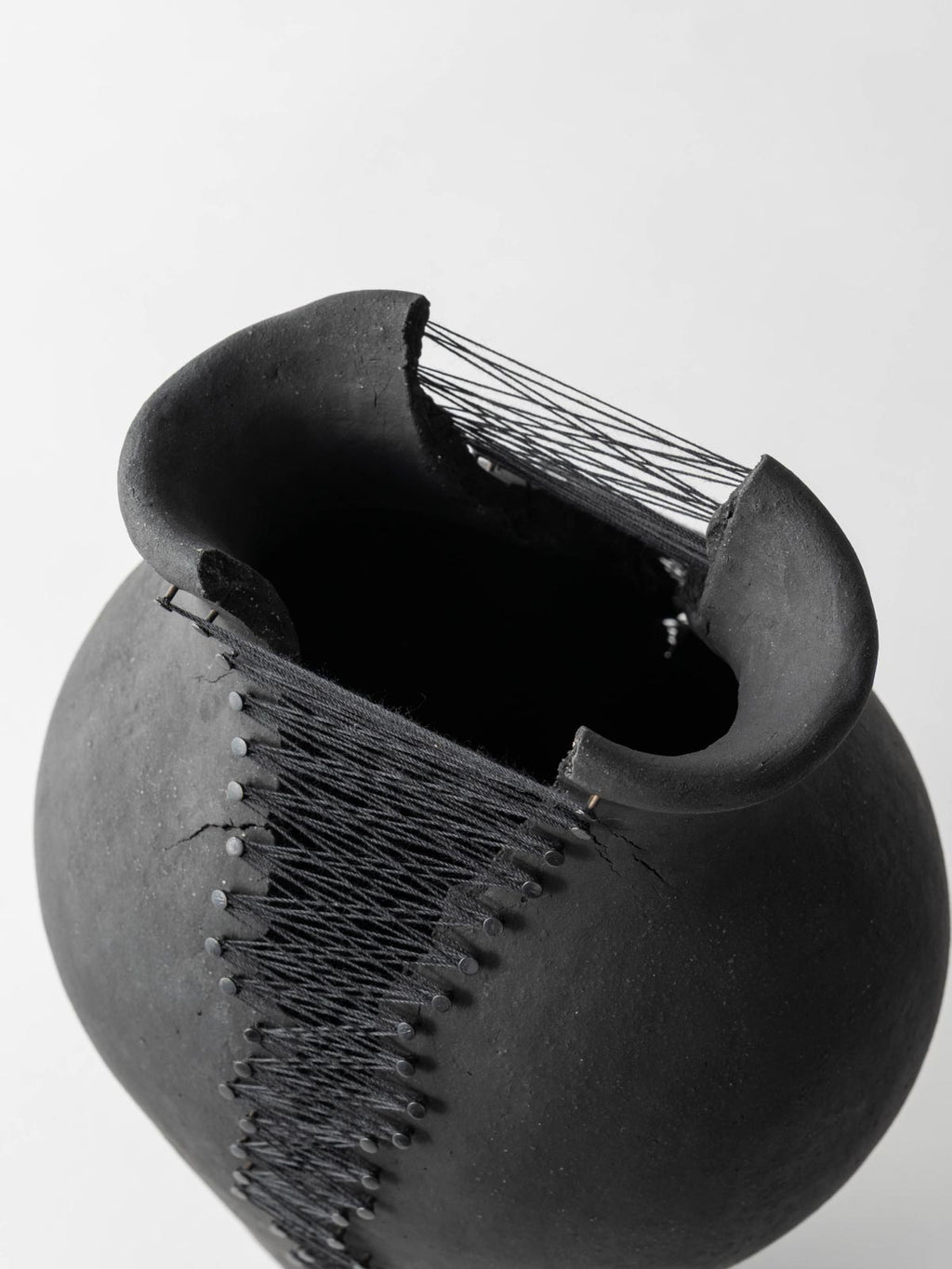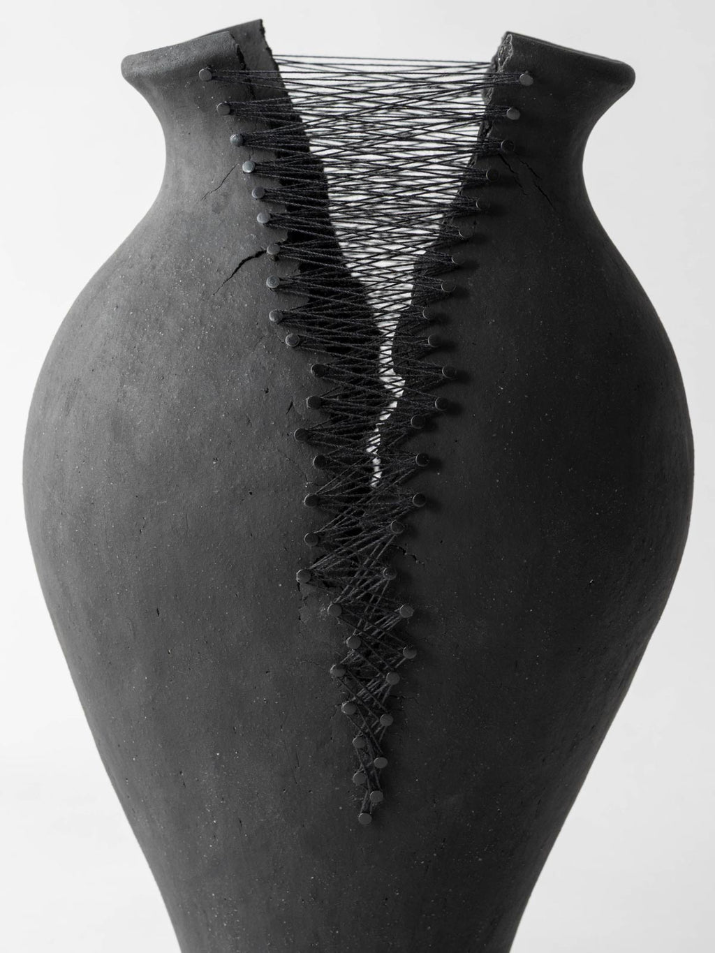 代表作の「dress」シリーズでは、「装う」をテーマに陶磁器の修繕技法の金継ぎに着目し、黒い楽焼の器をあえて破損し、割れによって生じた傷に、釘と糸で“ドレス”を纏わせる。「MYO」シリーズは、黒土の器に幾何学模様を刻み込み、モノトーンゆえの“白と黒どちらを見るか”という視覚の揺らぎを狙う。