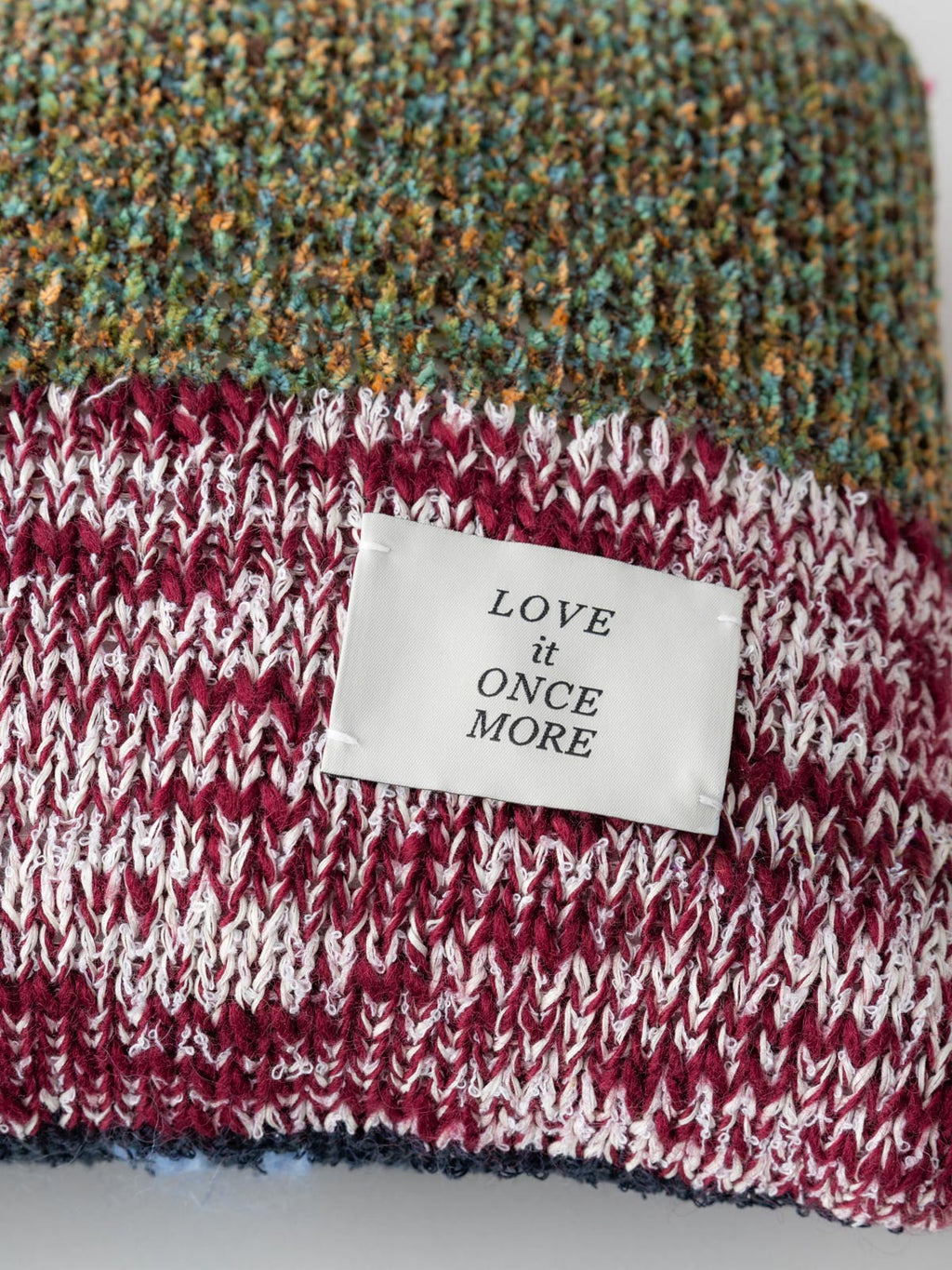 企業でのニットデザイナーを経て、デザイナーMARO KUROTANIが2019年にスタート。「もう一度愛する」という名のとおり<LOVE it ONCE MORE(ラヴィットワンスモア)>は、エゴのない物作りをしたいという思いから、寄付された糸や余剰糸など廃棄されるはずだった素材を使用し、再び息吹を吹き込むアップサイクル・ニットに特化したサステナブルなブランド。家庭用編み機を使い、全て手作業によるハンドメイドならではの色や柄の組み合わせと温かみのあるデザインが人気。