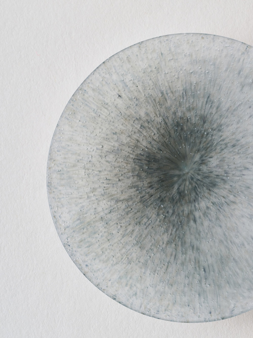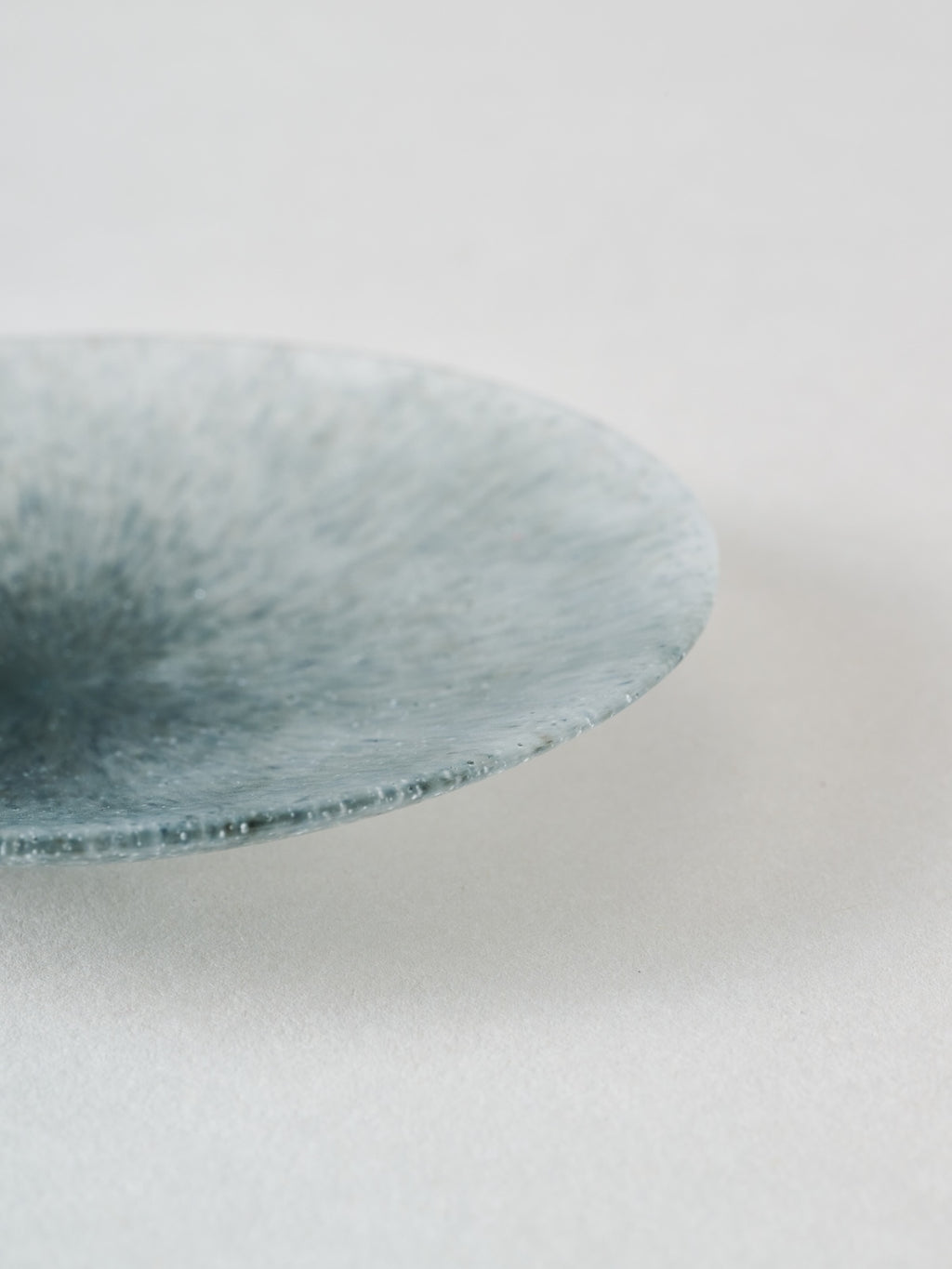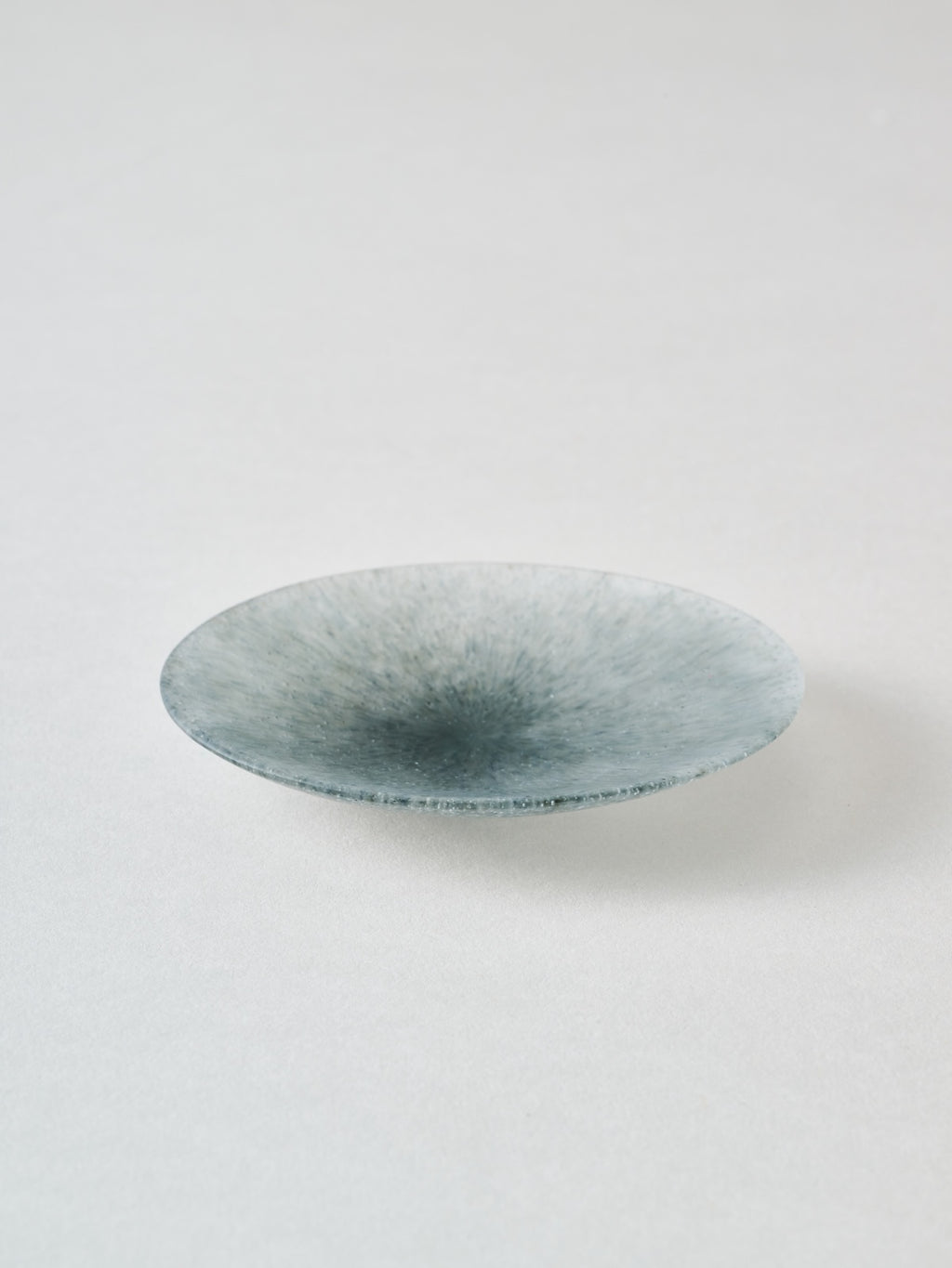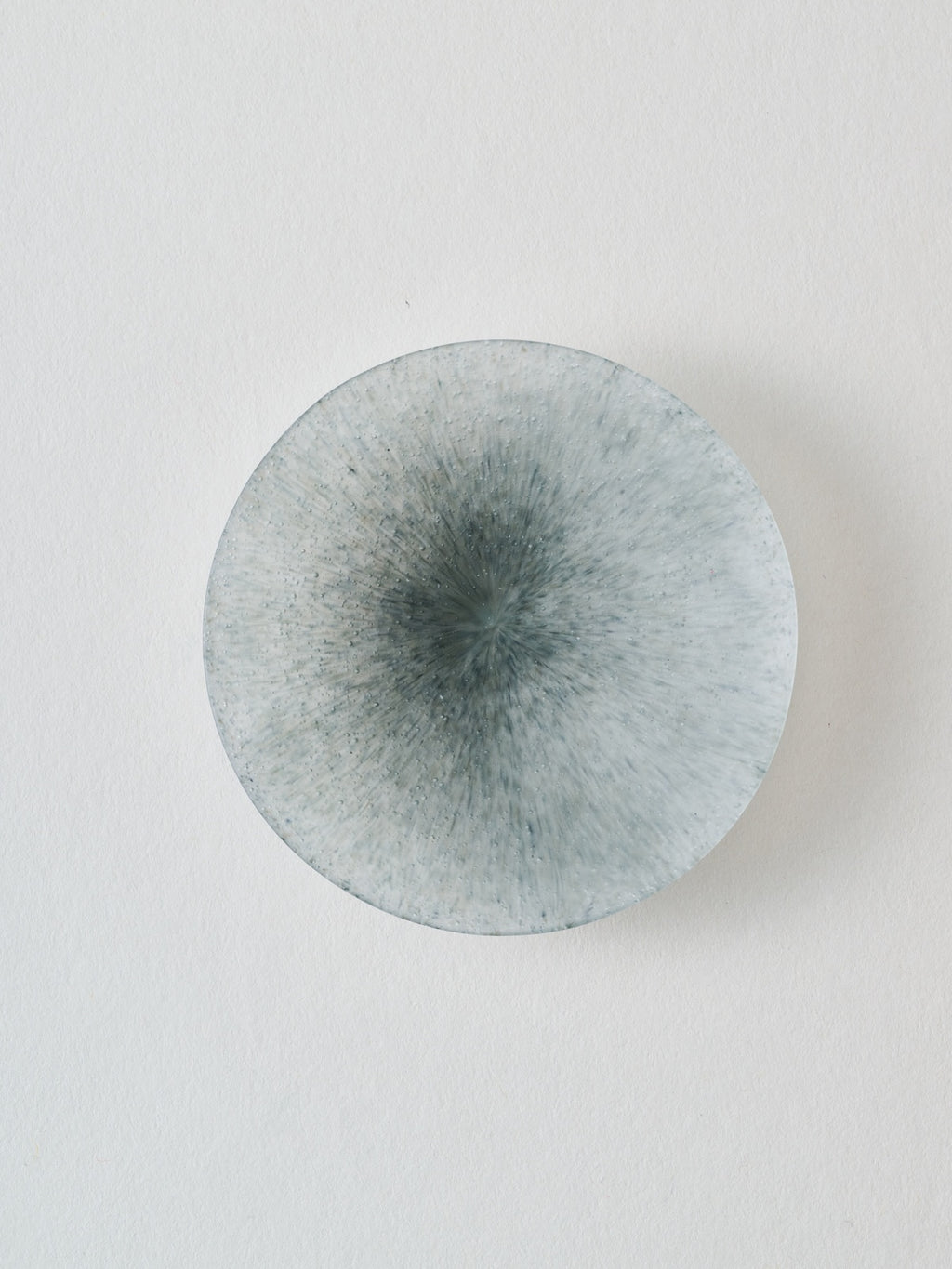 曇り空のような、水墨画のような、ニュアンスのあるグレーのヴェールを纏った、端正なラインが生み出すミニマルなガラスの器。ガラス作家・波多野裕子は、砕いたガラスの粉末を型に詰めて焼成する、伝統的なガラス工芸のパート・ド・ヴェール寄りのキルンキャスティング技法を用いて、日常に寄り添う道具を作る。