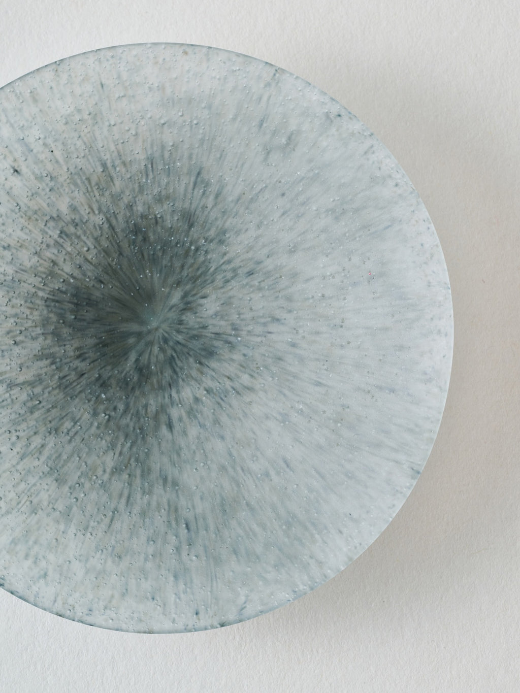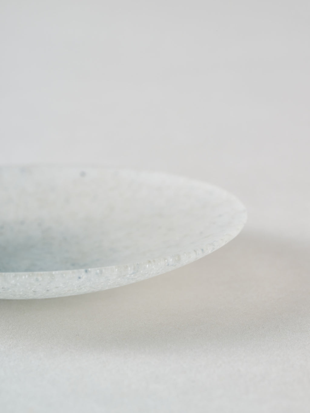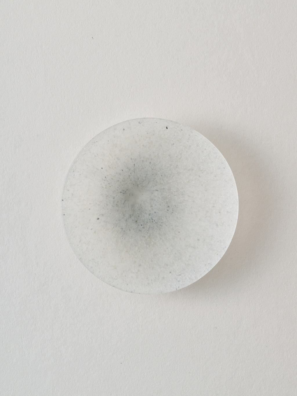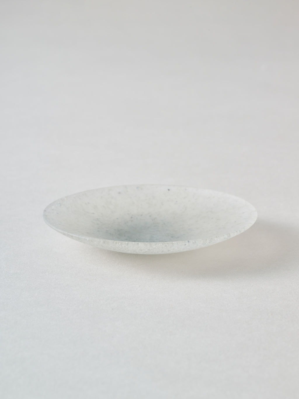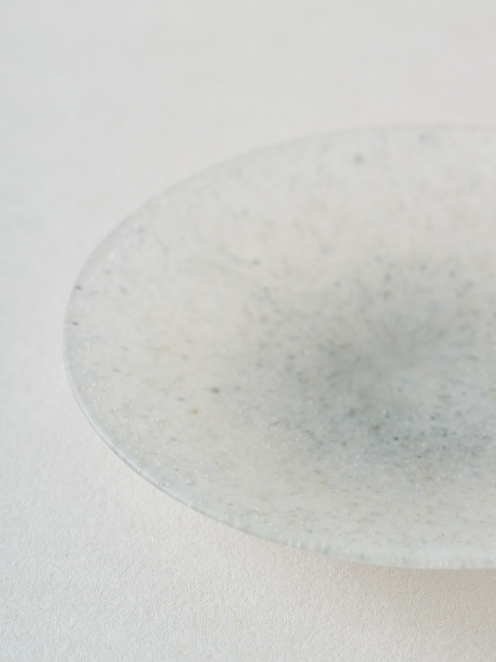 曇り空のような、水墨画のような、ニュアンスのあるグレーのヴェールを纏った、端正なラインが生み出すミニマルなガラスの器。ガラス作家・波多野裕子は、砕いたガラスの粉末を型に詰めて焼成する、伝統的なガラス工芸のパート・ド・ヴェール寄りのキルンキャスティング技法を用いて、日常に寄り添う道具を作る。