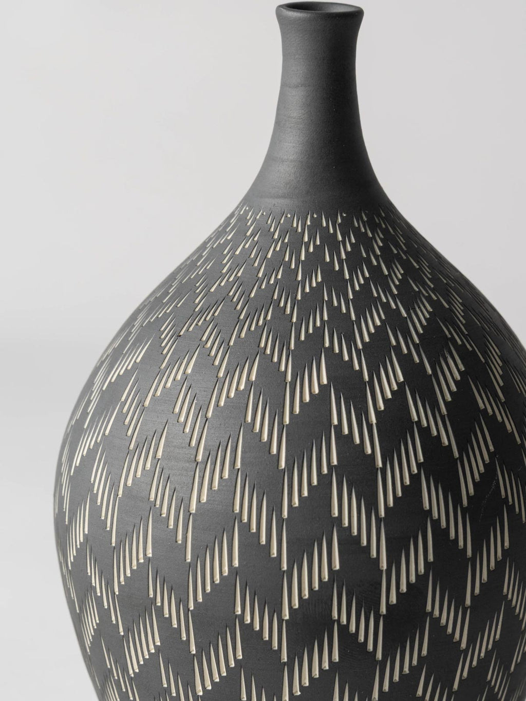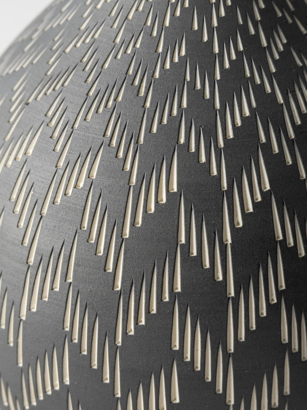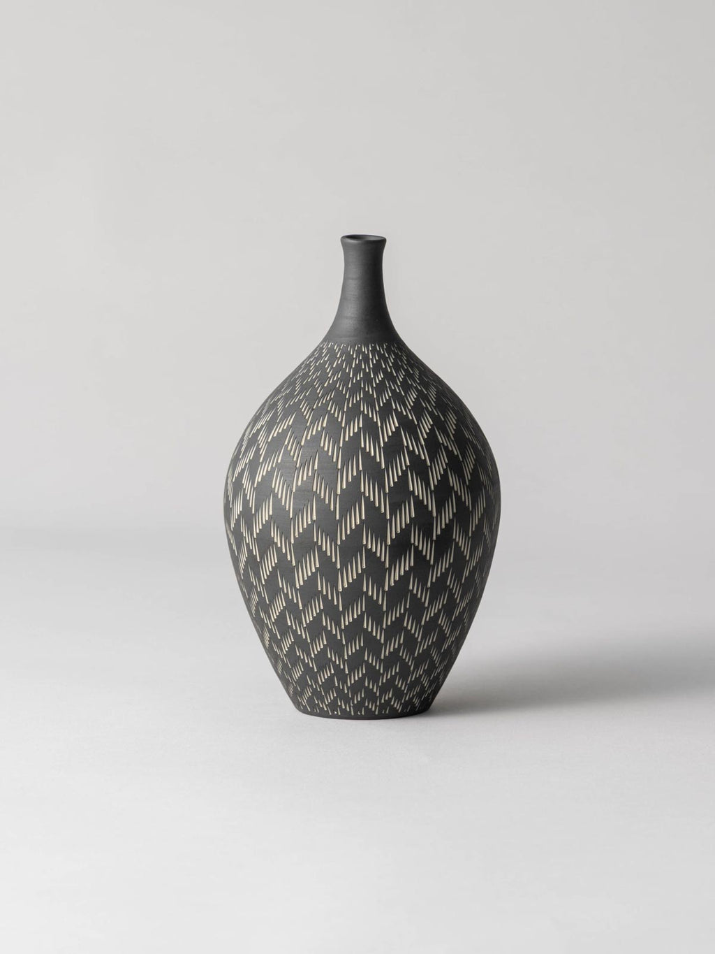 代表作の「dress」シリーズでは、「装う」をテーマに陶磁器の修繕技法の金継ぎに着目し、黒い楽焼の器をあえて破損し、割れによって生じた傷に、釘と糸で“ドレス”を纏わせる。「MYO」シリーズは、黒土の器に幾何学模様を刻み込み、モノトーンゆえの“白と黒どちらを見るか”という視覚の揺らぎを狙う。
