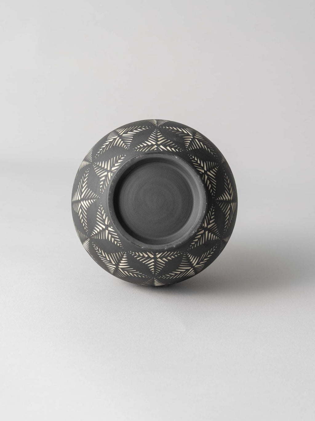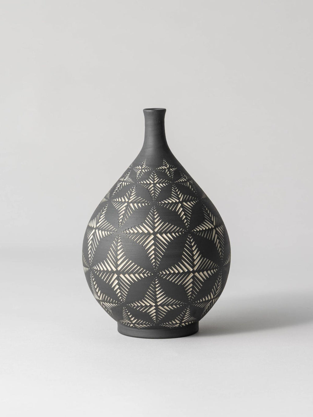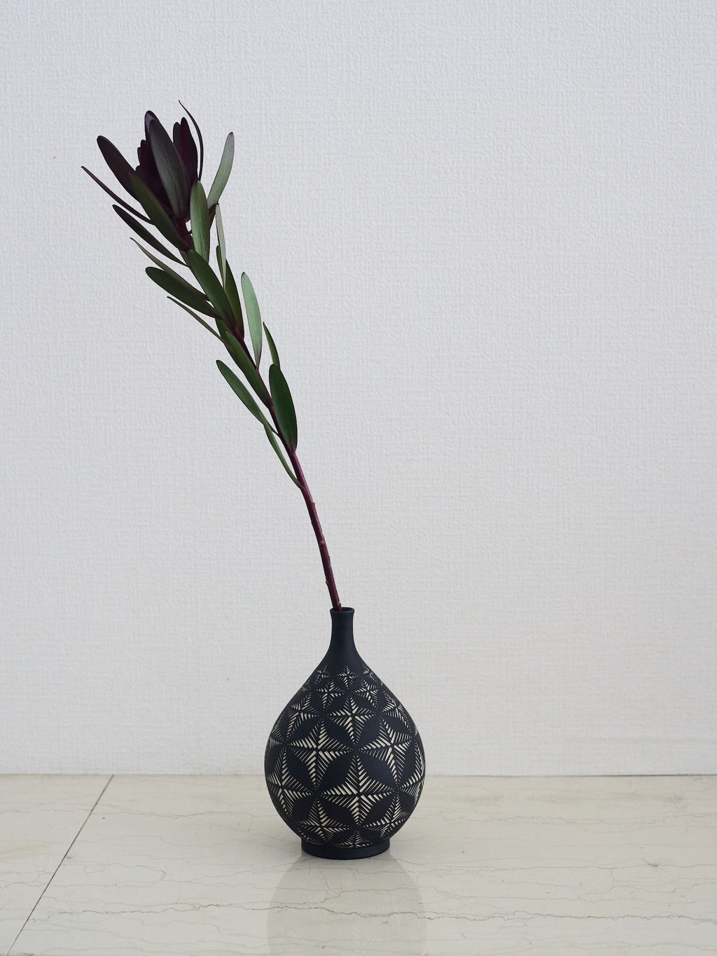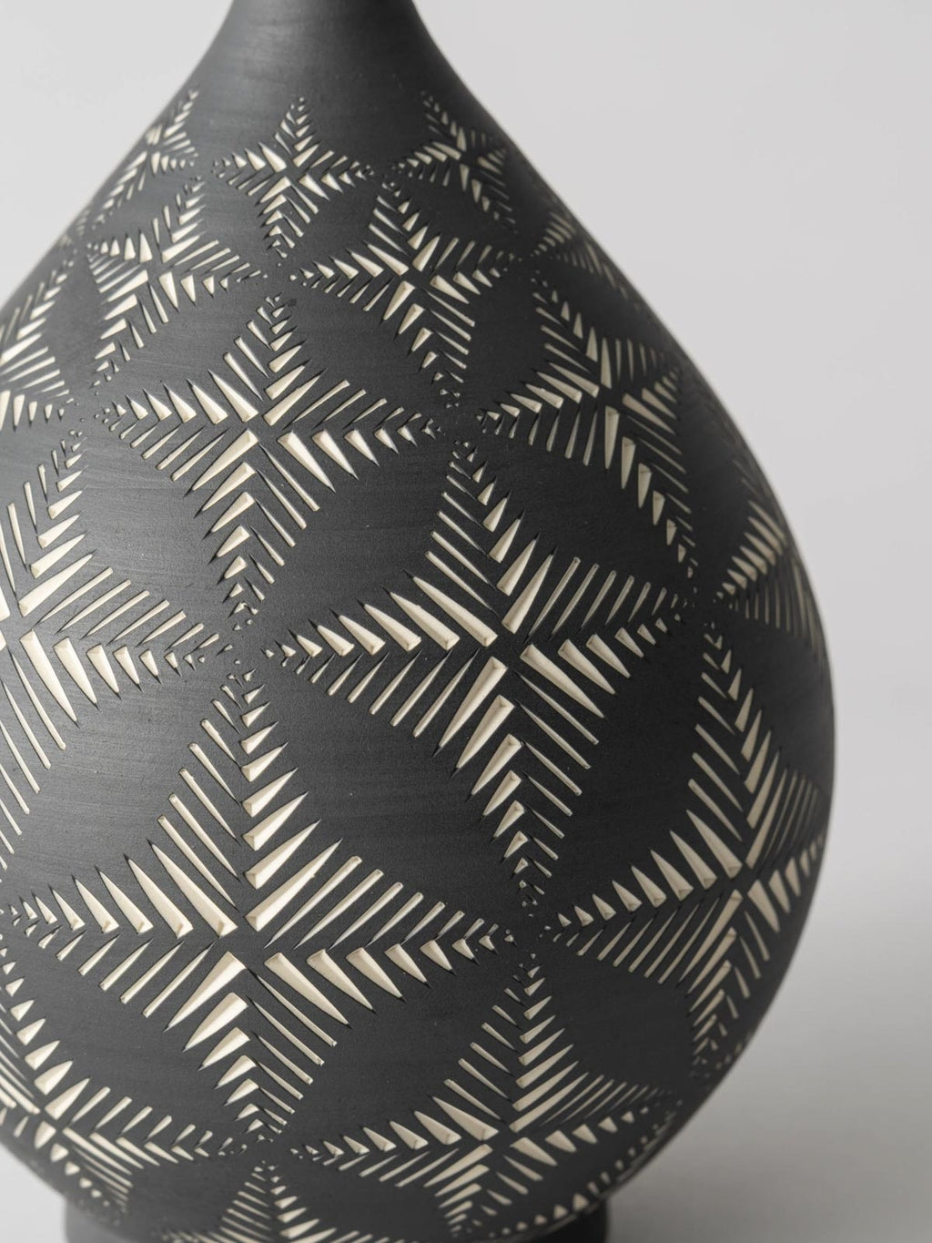 代表作の「dress」シリーズでは、「装う」をテーマに陶磁器の修繕技法の金継ぎに着目し、黒い楽焼の器をあえて破損し、割れによって生じた傷に、釘と糸で“ドレス”を纏わせる。「MYO」シリーズは、黒土の器に幾何学模様を刻み込み、モノトーンゆえの“白と黒どちらを見るか”という視覚の揺らぎを狙う。
