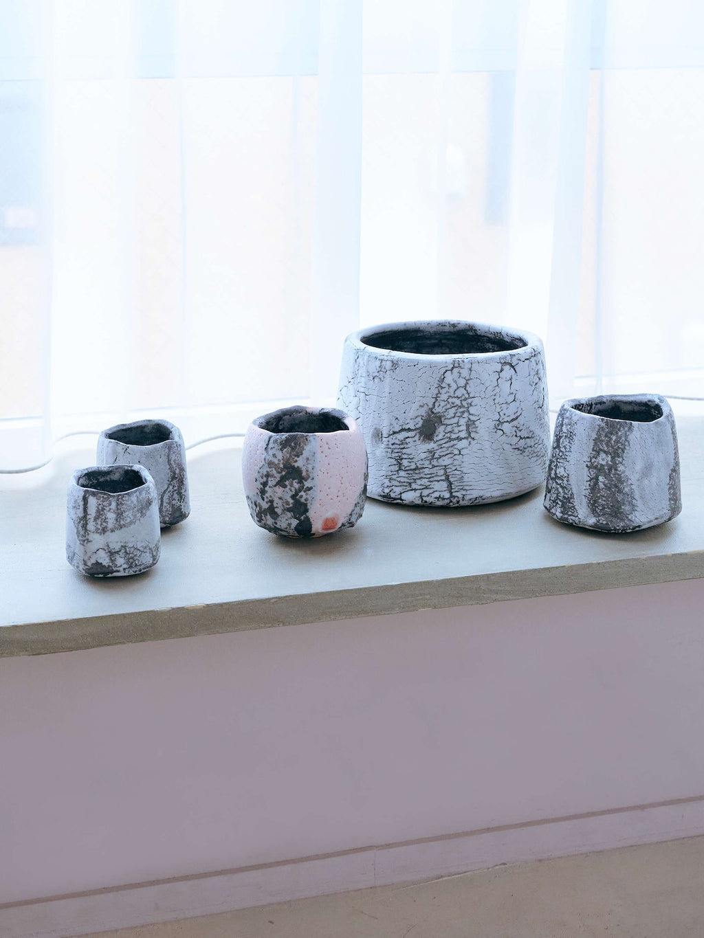 安土桃山時代、中国の白磁に近い焼き物を作ろうとして美濃の国(現在の岐阜県南部)に誕生した「志野」に向き合う陶芸家、林友加。人間国宝、荒川豊蔵の流れをくむピンクとグレーの配色にはじまり、モノトーンやミニマルなデザインが好きだという独自の視点と感性で、白、グレー、黒の作品を制作。伝統を受け継ぎながらも、今の暮らしに合う、現代の志野を探求しています。志野を代表する茶碗、ぐい呑み、小壷など用途のあるものから、一輪挿しや水注ぎの形をしたオブジェなど志野の可能性を広げています。
